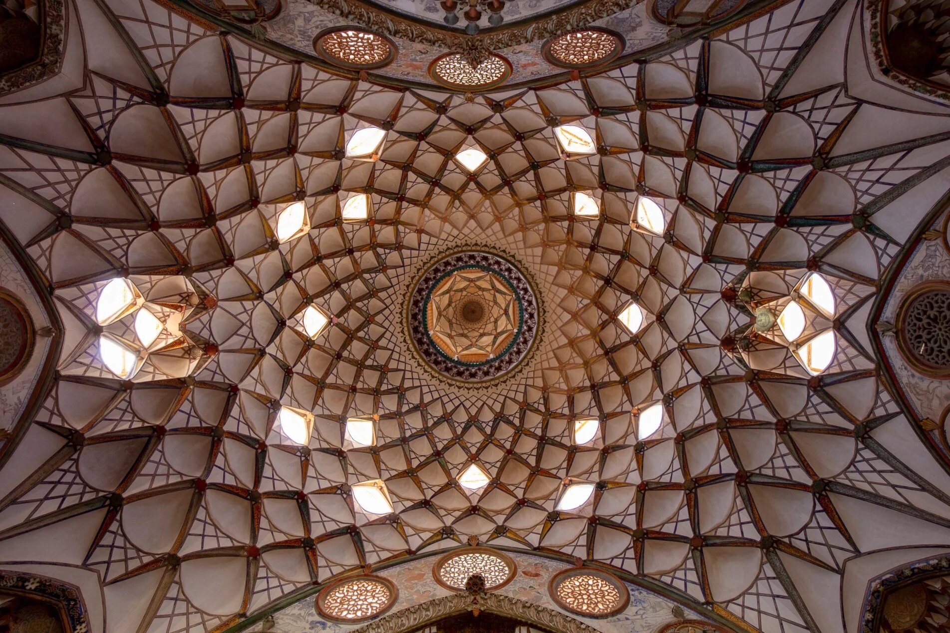 La maison des Boroudjerd à Kachan a été conçue par Ustad Ali Maryam, un architecte du XIXe siècle, qui a débuté sa carrière comme apprenti sur la mosquée Agha Bozorg (voir ci-dessus). Le bâtiment, qui appartenait autrefois à un marchand de Kachan, est décoré de stuc, de verre et de miroirs. Il n’était pas inhabituel pour les riches et les nantis d’Iran de s’inspirer, pour leurs maisons, des concepts biruni (extérieur) et andaruni (intérieur) utilisés dans les mosquées. La maison maison des Boroudjerd est réputée pour l’intérieur de son dôme, considéré comme l’un des meilleurs exemples de cette approche (Afaq Ali).