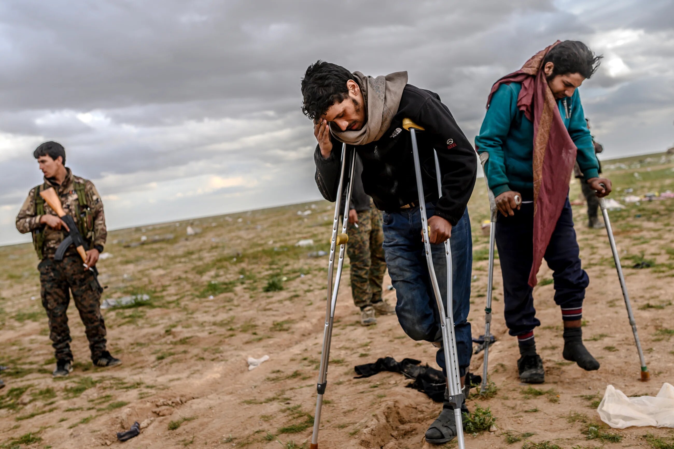 Des hommes soupçonnés d’être des combattants de l’EI attendent d’être fouillés par des membres des FDS. Beaucoup de ceux qui sortent de Baghouz sont blessés ou malades (AFP)