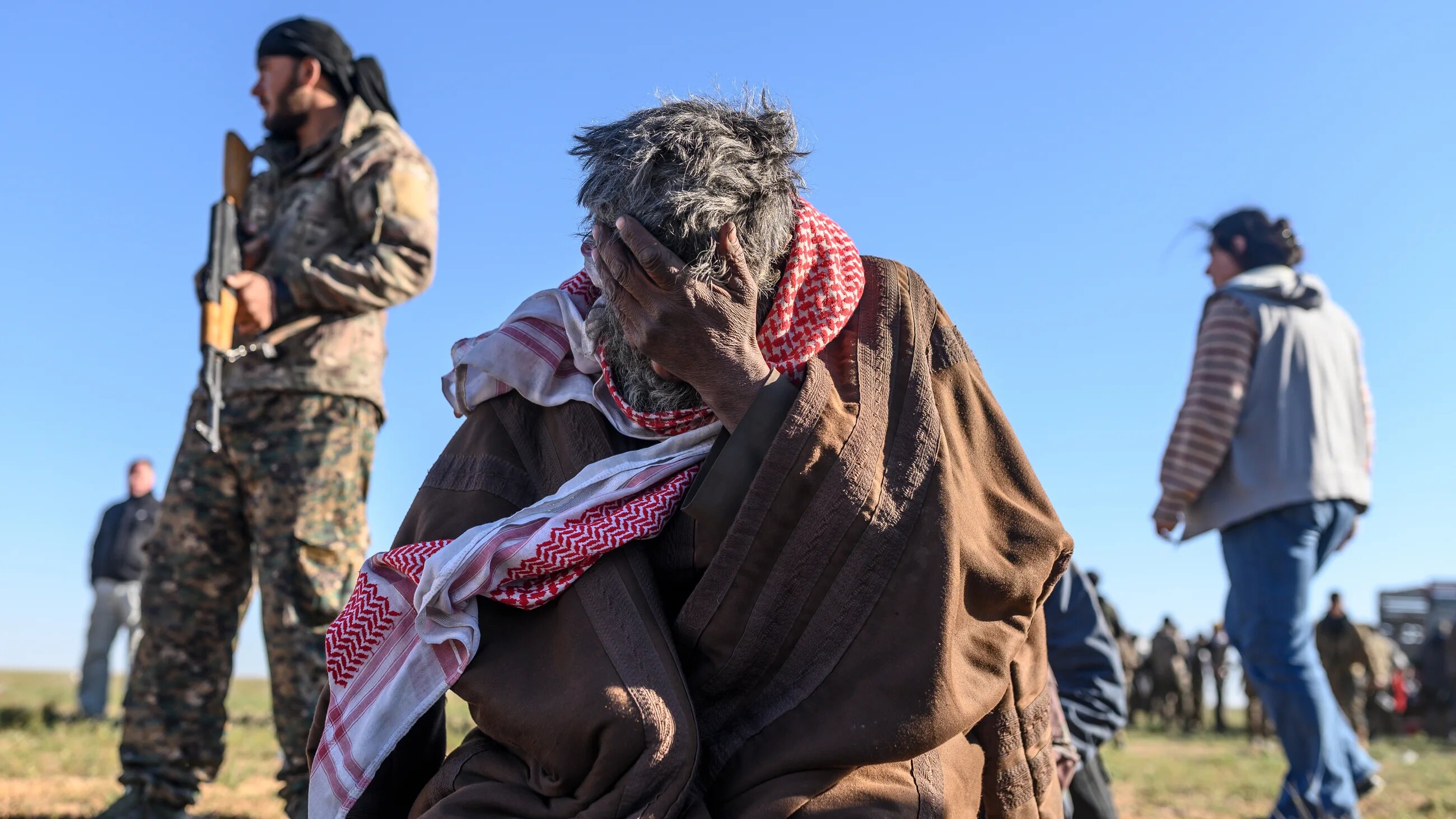 Un homme assis, plaquant sa paume sur son visage, après avoir quitté Baghouz. Les frappes aériennes et les assauts au sol contre l’enclave de l’État islamique ont été quasi-incessants ces derniers jours, et les personnes en fuite ont déclaré que les ressources en nourriture s’épuisaient (AFP)