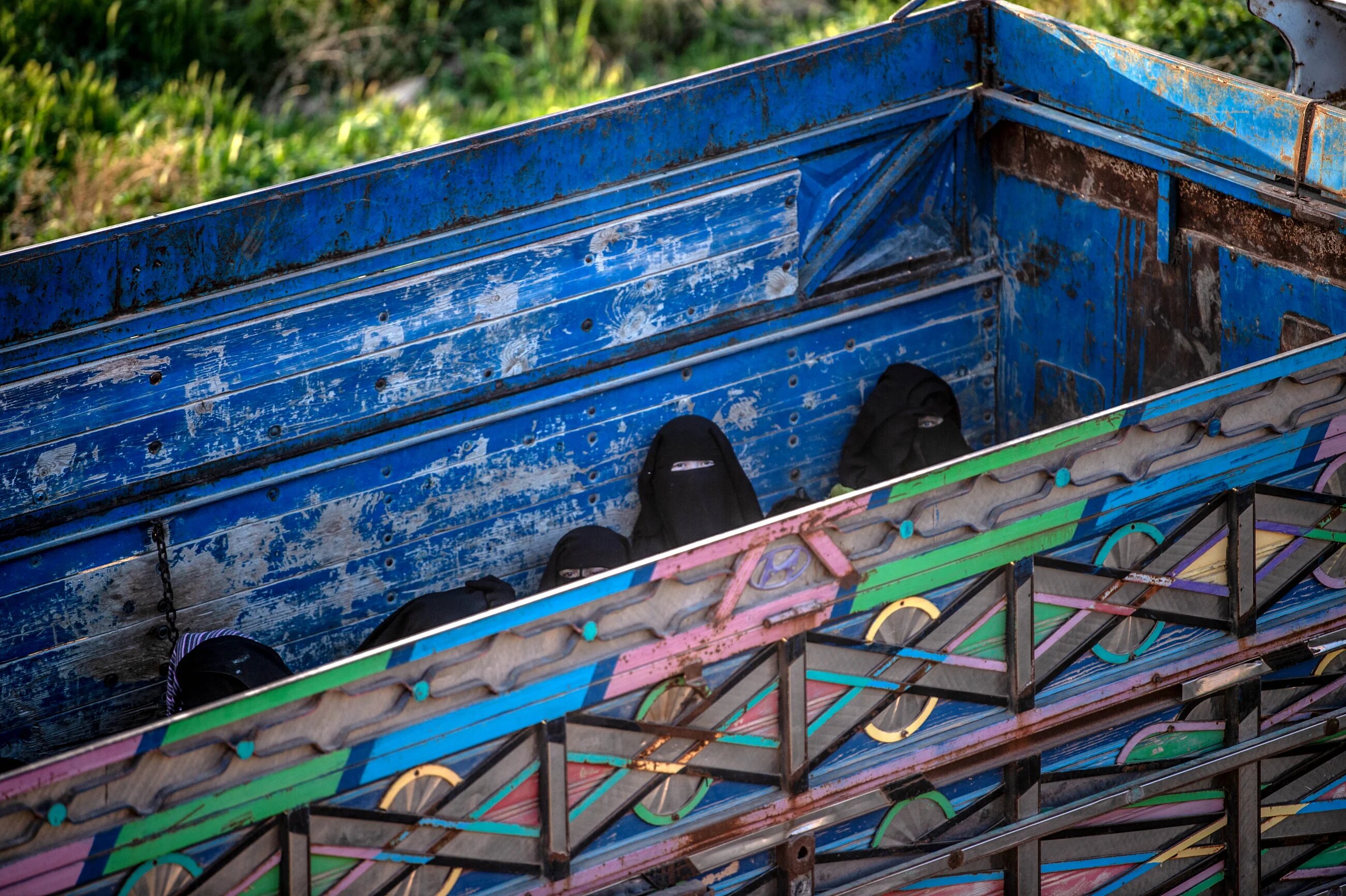 Les femmes et les enfants qui ont fui Baghouz montent à l’arrière de camions dans une zone contrôlée par les FDS (AFP)
