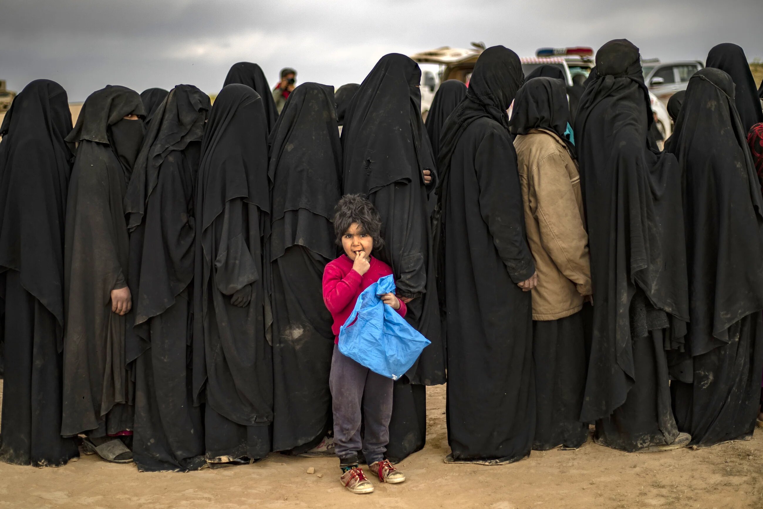 Des femmes et des enfants font la queue à un point de contrôle dans une zone gérée par les FDS, qui sont soutenues par les États-Unis. Des centaines de femmes et d’enfants avançaient péniblement dans le désert balayé par les vents de l’est de la Syrie, transportant le peu qu’ils pouvaient après avoir fui le dernier carré de territoire de l’EI (AFP)