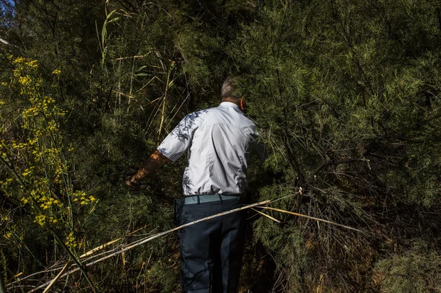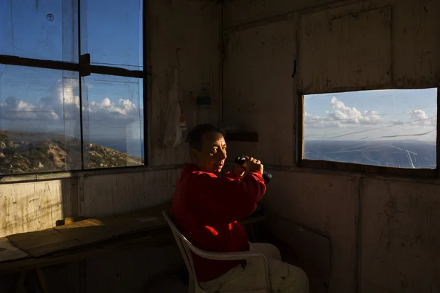 Vincenzo Marsala, un agent de la garde forestière près de la réserve naturelle de Torre Salsa, scrute la mer avec ses jumelles depuis sa cabine mobile. Leur mission : ils surveillent les réserves naturelles pour la prévention des incendies très fréquents pendant l’été. Leur rôle n’est pas de contrôler la migration illégale mais après ce sont eux qui alertent les autorités après des « débarquements fantômes ».