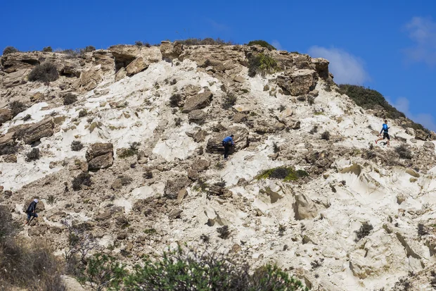 Des jeunes harragas qui viennent d’arriver sur les côtes siciliennes de Torre Salsa s’enfuient dans les collines devant la plage, le 10 octobre 2017. Ils ont eu de la chance : selon l’Organisation internationale pour les migrations (OIM), 15 000 migrants se sont noyés en Méditerranée centrale depuis 2013. S’ils ne sont pas arrêtés par la police, ils poursuivent leur voyage, souvent vers la France.