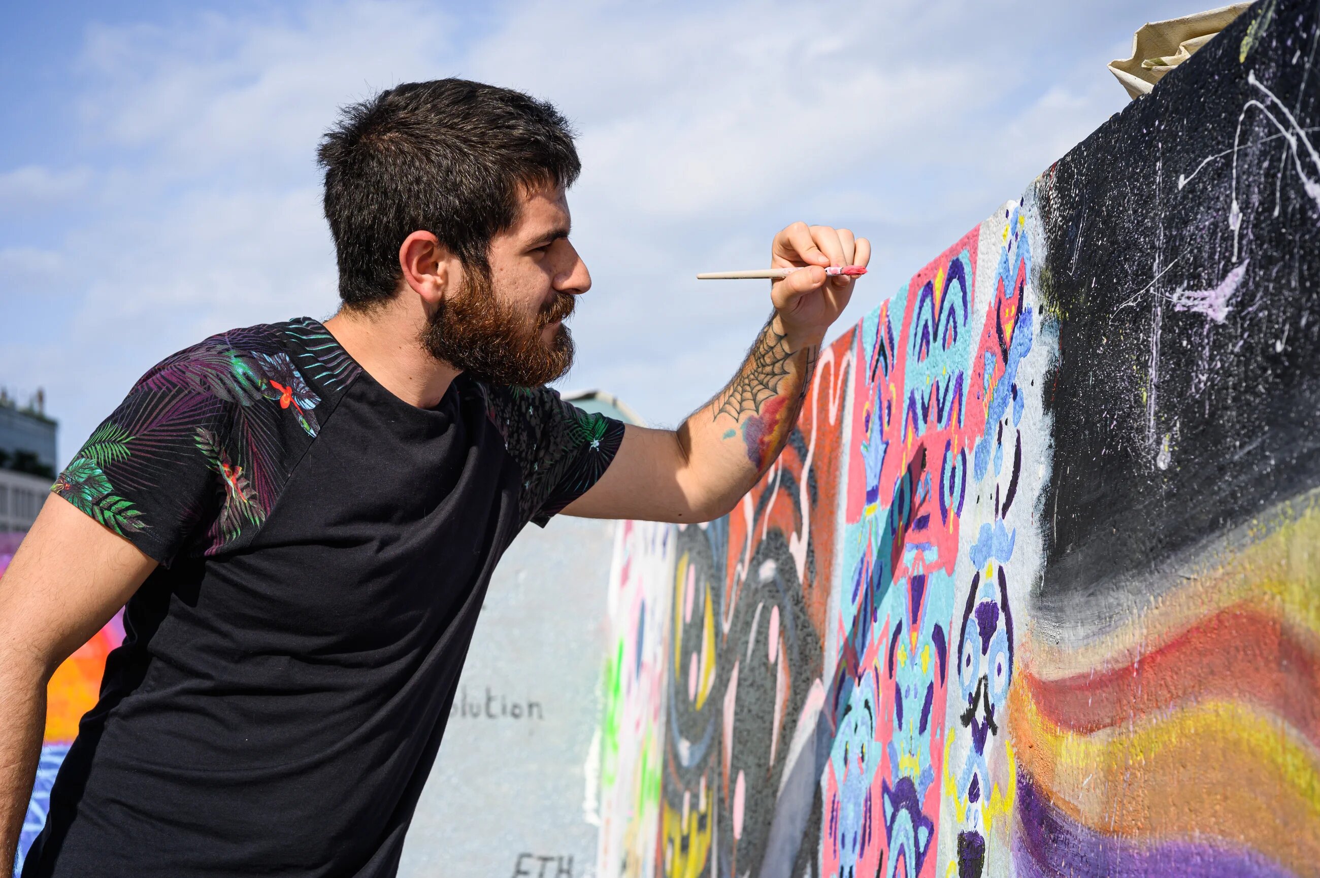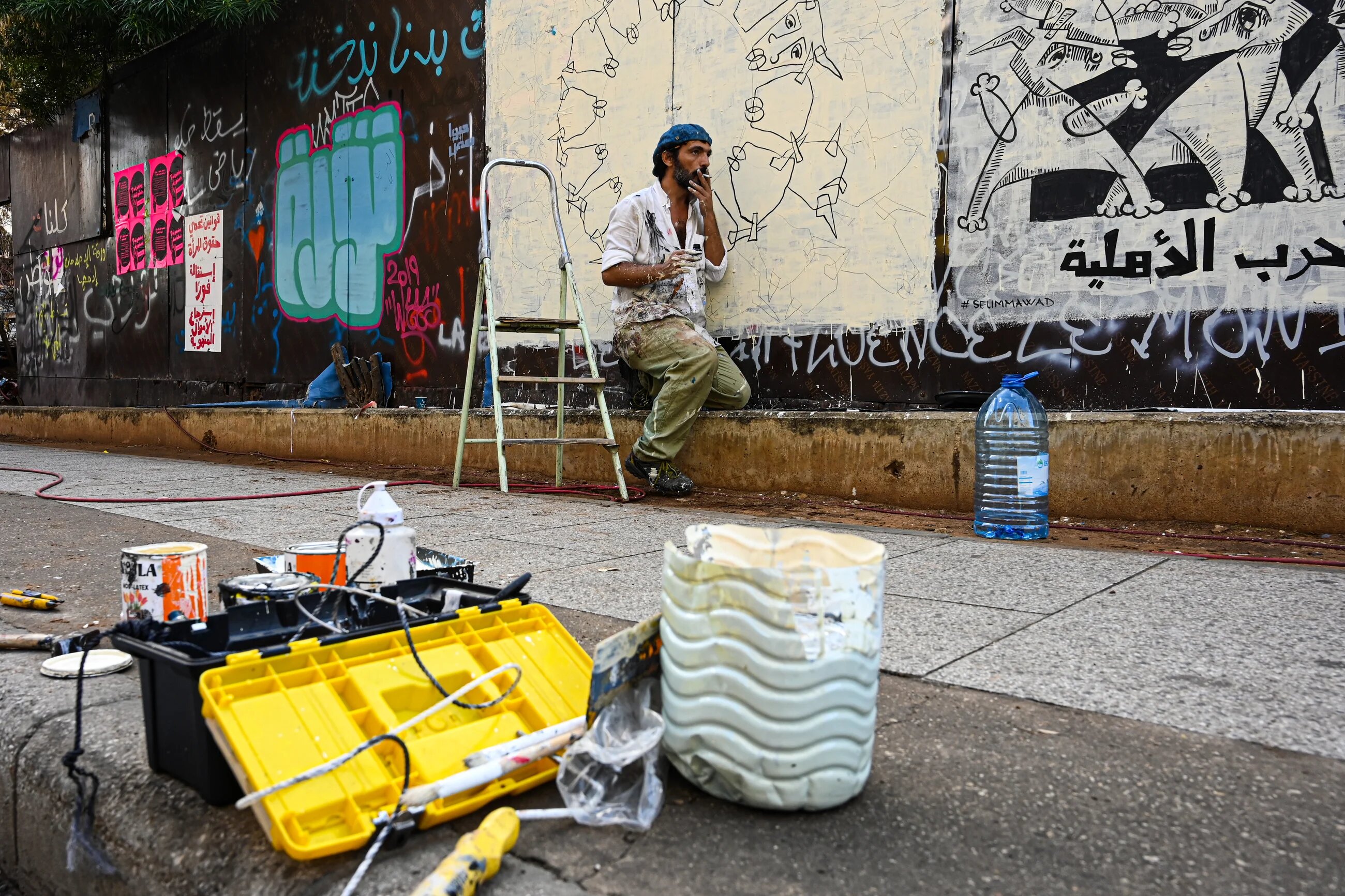 L’artiste de rue Selim Mawad fait une pause cigarette avant de se remettre au travail. Cet artiste, qui a précédemment travaillé dans les domaines des droits de l’homme et de la réconciliation, a qualifié les récentes manifestations de « session de thérapie collective » pour les citoyens libanais (MEE/Finbar Anderson)