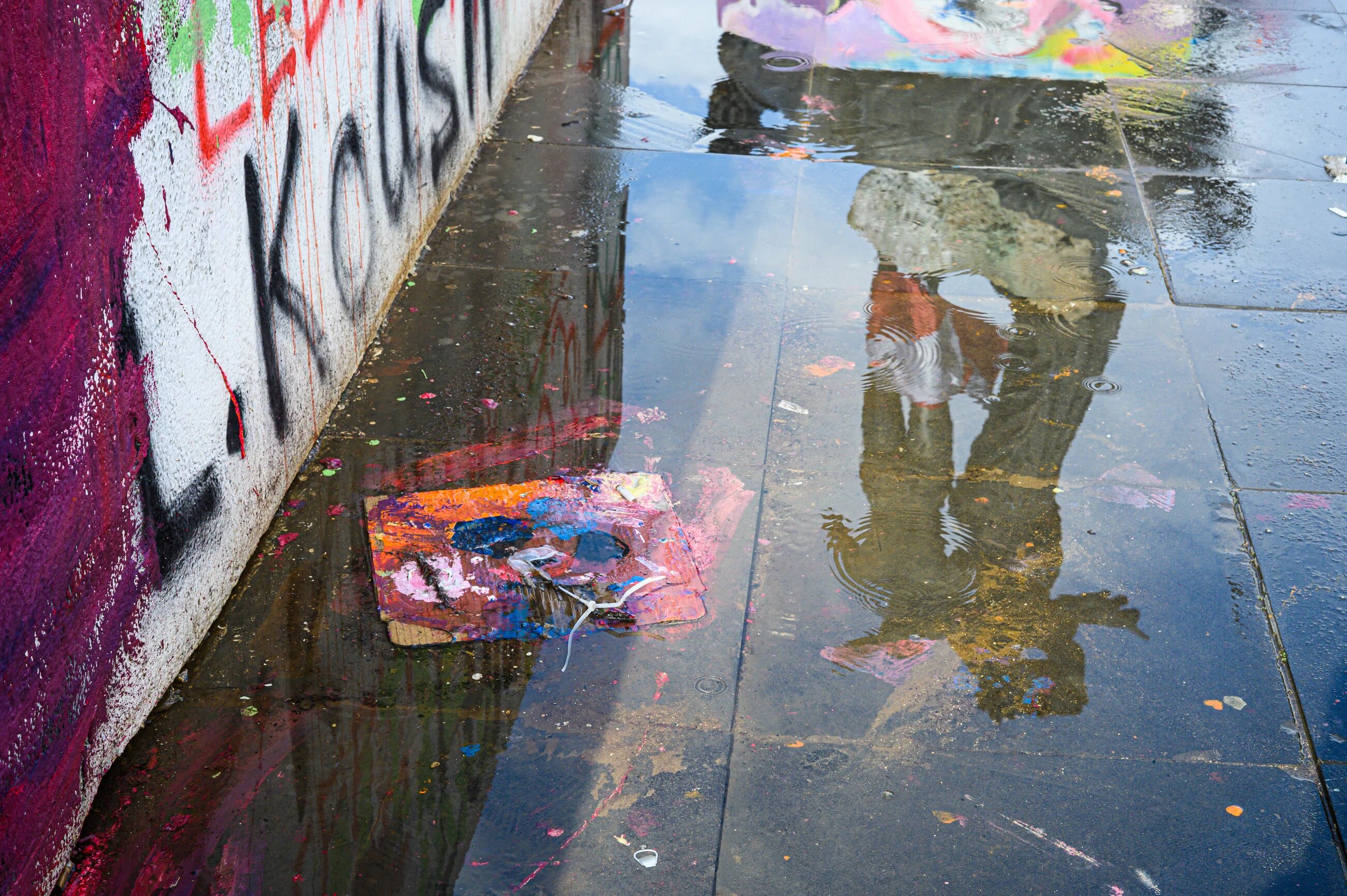 Une palette abandonnée dans une flaque d’eau qui réfléchit la célèbre statue criblée de balles (MEE/Finbar Anderson)
