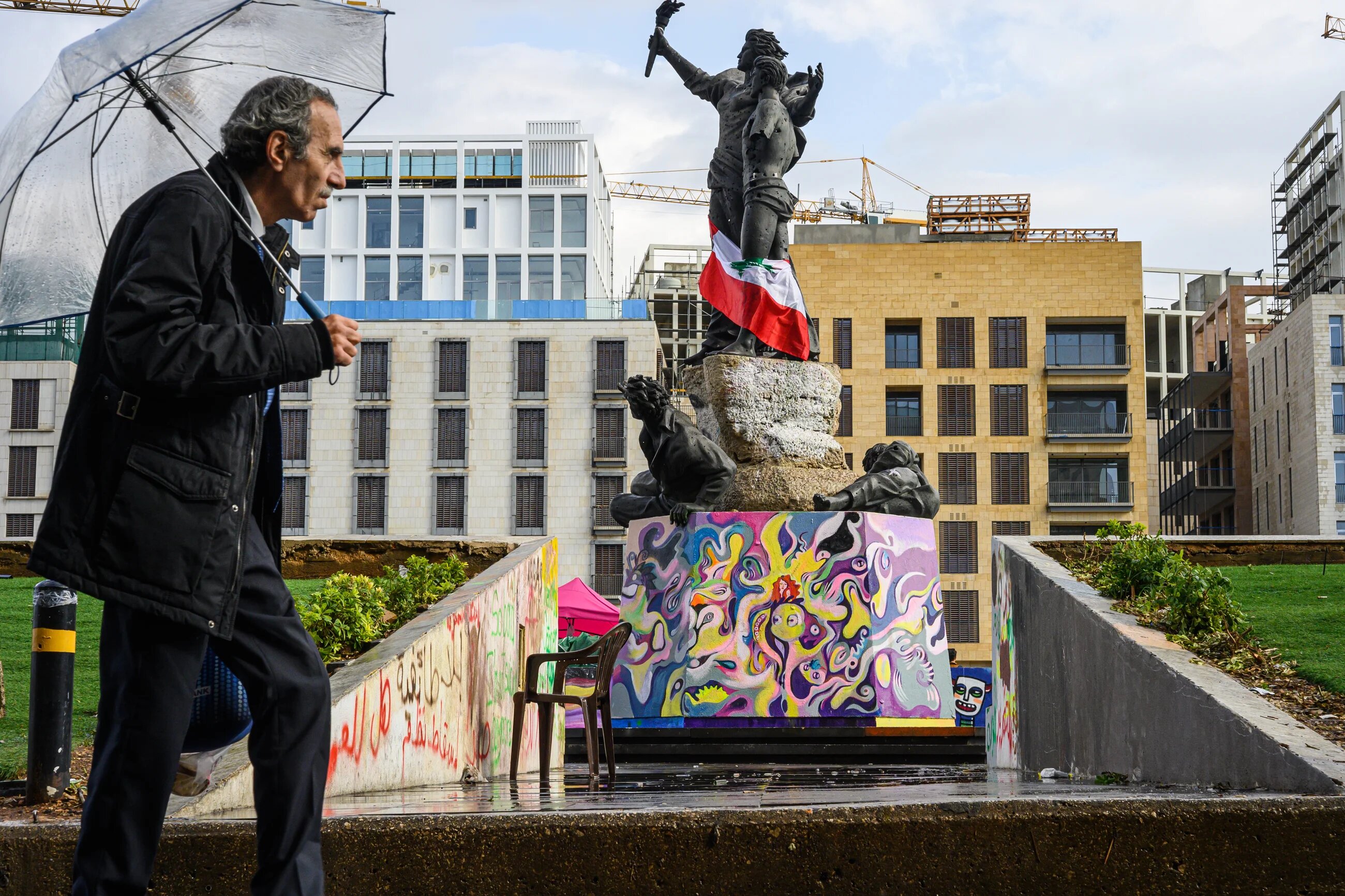 Un homme passe à côté de la statue de la place des Martyrs lors d’une journée pluvieuse au Liban. En grande partie détruite pendant et après la guerre civile (1975–1990), la place était un point focal de la ville. Elle bénéficie d’un nouveau souffle depuis le début des manifestations (MEE/Finbar Anderson)