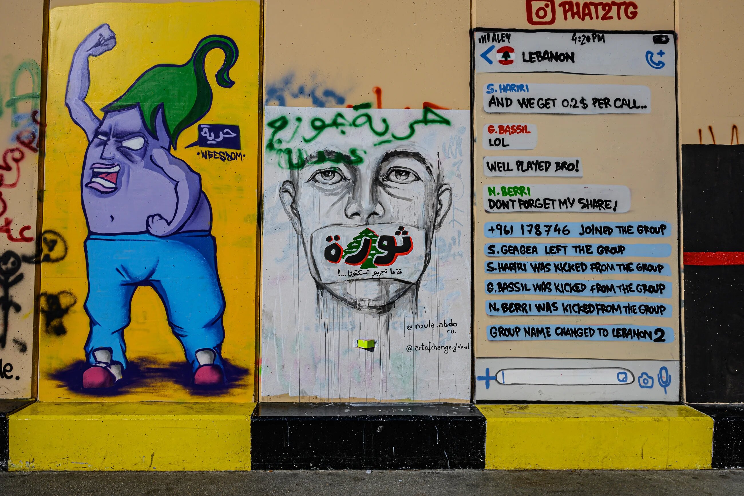 Une fresque à côté de la place Riad al-Solh représente un homme portant un bâillon orné du cèdre libanais sur lequel on peut lire « thawra » (révolution). À droite, une conversation WhatsApp satirique imagine d’importantes personnalités politiques discuter de la taxe WhatsApp qui a contribué à déclencher les manifestations (MEE/Finbar Anderson)