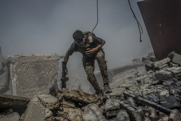 Un soldat des forces spéciales irakiennes aide une famille à traverser les décombres et les carcasses de véhicules bombardés, en tenant un bébé dans ses bras. Avec la fin des combats et le retour à un semblant de calme dans les quartiers Ouest, pourtant ravagés par les frappes aériennes et les bombardements, certains habitants qui avaient fui, tentent de revenir dans la ville. Mais souvent, il ne trouve que désolation. En attendant les grands projets, les habitants se débrouillent comme ils peuvent : pour l'électricité, il y a les générateurs de quartier auxquels il faut s'abonner, et pour l'eau, les distributions des camions-citernes ou des ONG. Les organisations d'aide présentes à Mossoul ont distribué des kits de construction à près de 12 700 familles. Mossoul, le 2 juillet 2017.