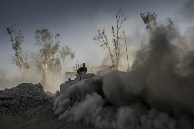 Un char de l’armée irakienne avance pour combattre l’EI, retranché dans un quartier de la vieille ville. Les forces irakiennes – soit plus de 100 000 hommes entre armée, police, forces kurdes et forces tribales – ont été formées par les États-Unis qui voulaient limiter leur implication sur le terrain. Mais elles ont subi de lourdes pertes. Selon le vice-président irakien, Nouri al-Maliki, il y aurait près de 200 000 tués et blessés dans les rangs des forces armées et policières. Mossoul, le 10 juillet.