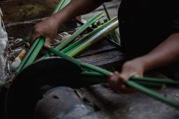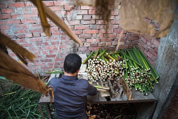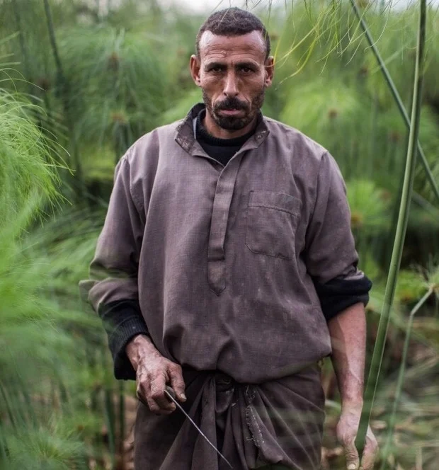 El-Sayed, qui a hérité ce savoir-faire artisanal de son père et de son grand-père, explique qu’après la récolte des tiges de papyrus, ils ôtent l’écorce verte en la pelant avec leurs dents, pour ensuite découper le cœur blanc en tranches. Elles sont alors mises à tremper dans des barils de soude caustique.