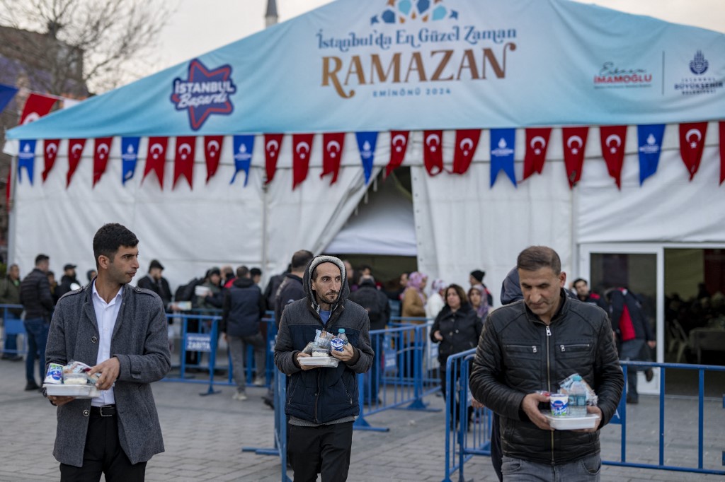 Au coucher du soleil sur le Bosphore, la file s’allonge en attendant l’iftar, le repas de rupture du jeûne de Ramadan offert par la municipalité d’Istanbul. Dans la foule des fidèles, beaucoup n’ont plus les moyens de le préparer chez eux.