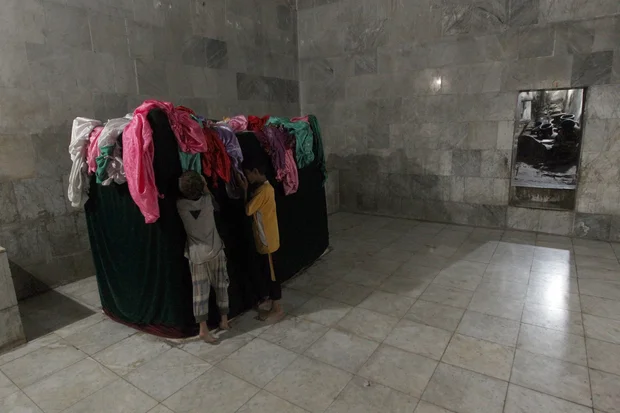 La foule massée dans un patio verdoyant pénètre alors à l'intérieur : une enfilade de pièces caverneuses, humides et faiblement éclairées, où ils touchent des lèvres les tissus aux couleurs vives drapés autour des tombes de chefs spirituels défunts.