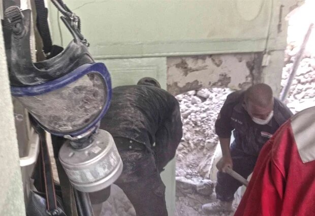Après deux heures de travail, l'odeur de décomposition maintenant suffocante indique aux hommes qu’ils sont sur le point d’atteindre des corps. Un autre volontaire ramène de la rue un tas de housses mortuaires noires pliées, et le dépose dans l’allée.