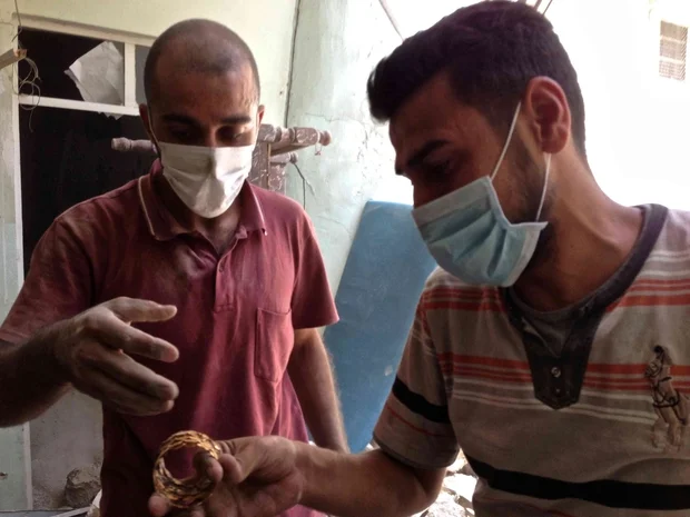 Le premier corps qu'ils trouvent dans les décombres est celui du père d'Omar. L'odeur est si intense que plusieurs hommes remettent leurs masques à gaz, en dépit de la chaleur torride. Avant de fermer la housse, ils enlèvent un anneau et le donnent à Omar, qui le garde sous ses yeux et articule à voix basse, « l’anneau de mon père ».