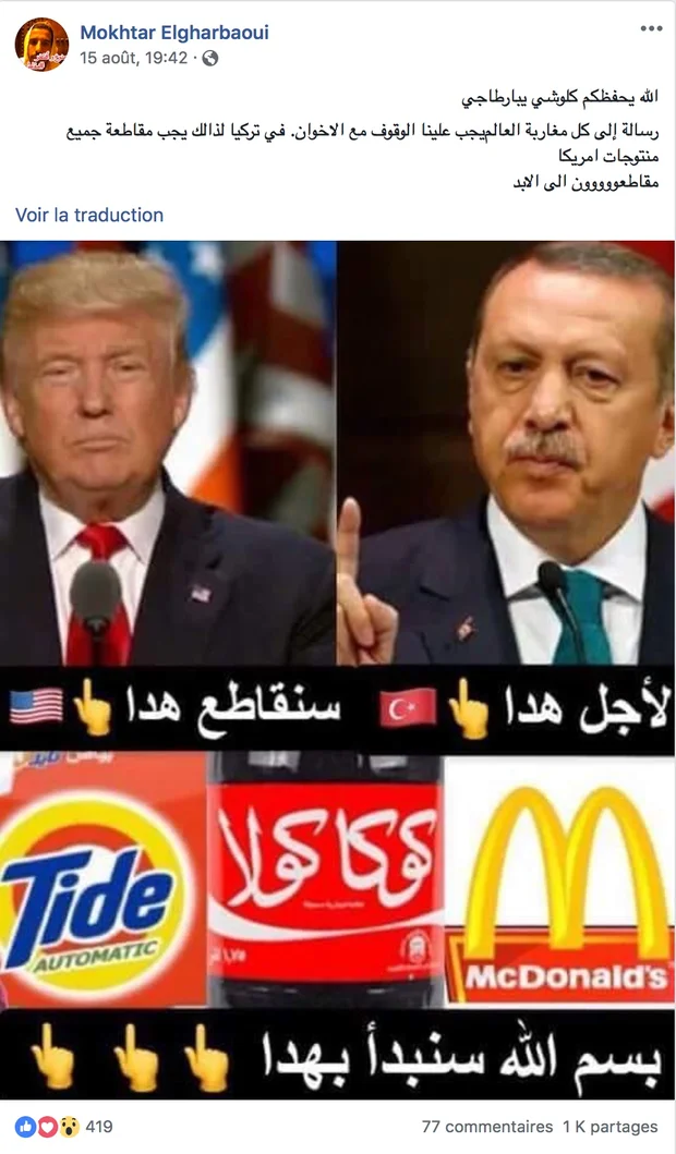 Traduction : « À tous les Marocains du monde, il nous faut soutenir nos frères Turcs. Pour Erdoğan, nous boycotterons Trump. Et nous commencerons par ces trois enseignes (McDonald's, Coca-Cola, Tide) »