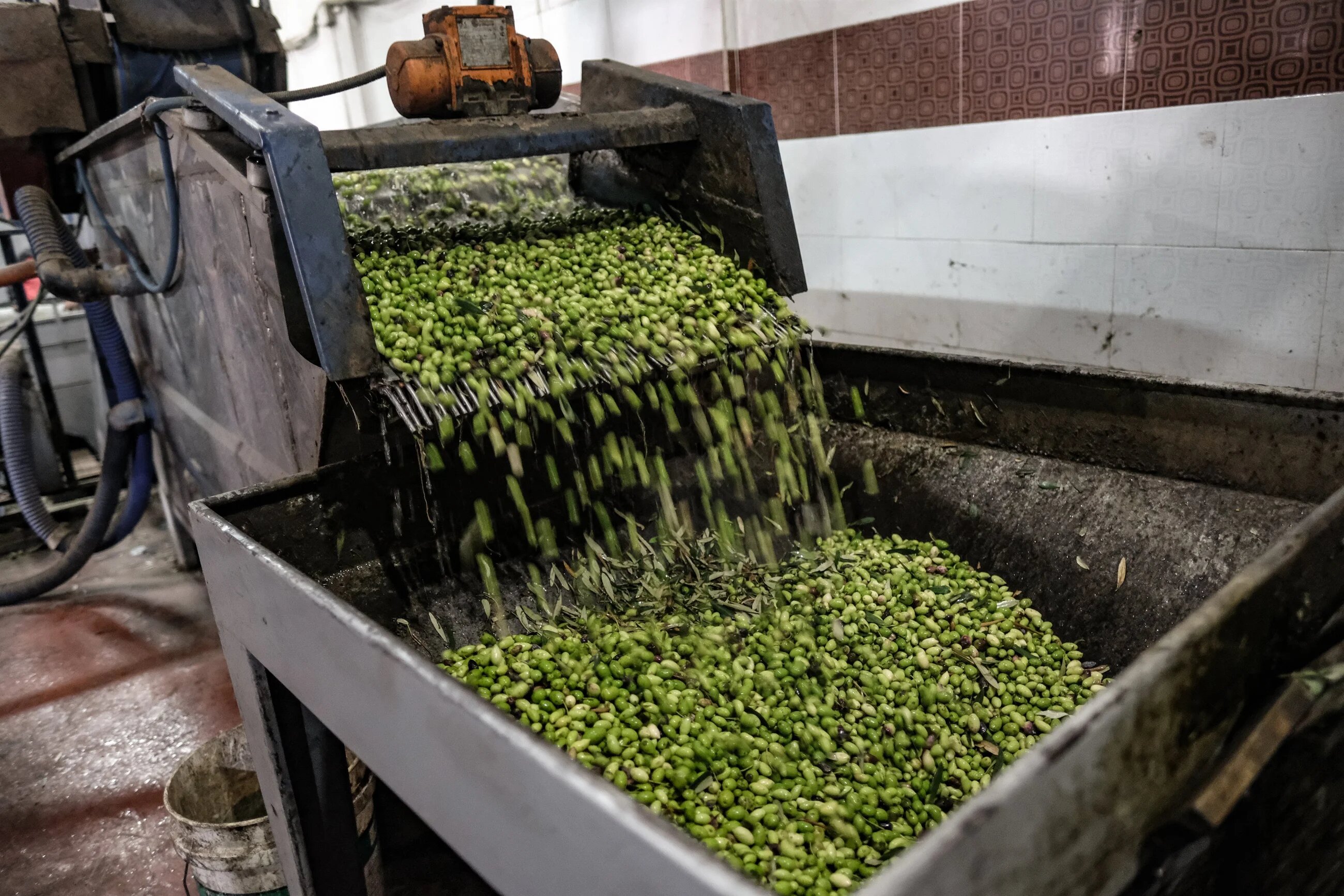 Une fois la récolte terminée, une partie est distribuée sur les marchés et l’autre est envoyée aux usines pour commencer la phase d’extraction de l’huile. La première étape consiste à séparer les olives des feuilles et des branches, elles sont ensuite lavées et moulues. (MEE/Fatima Shbair)