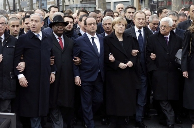 Netanyahou, Hollande et Abbas (de gauche à droite) à la marche de dimanche (AFP).