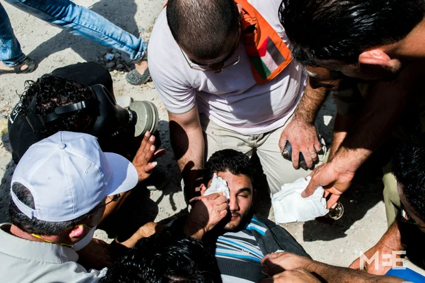 Des dizaines de soldats israéliens ont répliqué par des tirs de gaz lacrymogènes sur les manifestants, qui ont couru se mettre à l’abri. De nombreux manifestants ont souffert de l’inhalation de gaz lacrymogène et quelques-uns ont été blessés par le métal des grenades qui ont été lancées pour disperser le gaz.