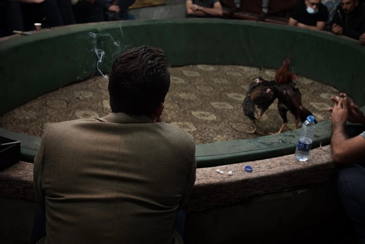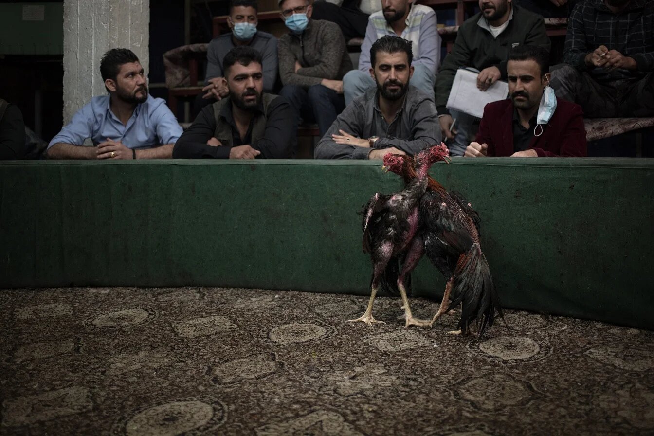 Malgré le COVID-19, une cinquantaine de spectateurs sont présents dans la salle, venant de tous horizons. Si l’élevage de coqs peut être un passe-temps pour certaines personnes disposant d’un niveau de vie élevé ou venant de familles importantes, la plupart des parieurs sont issus des classes populaires. Certains sont des réfugiés iraniens, venant parier dans l’espoir de sortir les poches pleines.