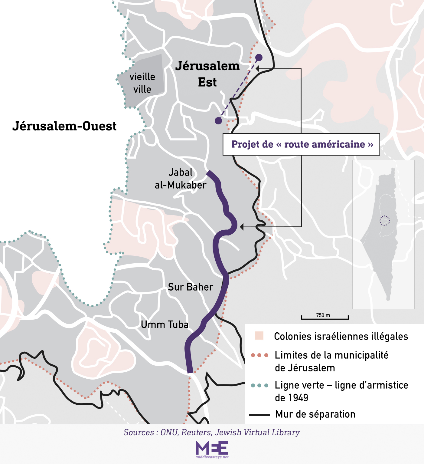 Le projet de la « route américaine », qui doit son nom à une petite route abandonnée construite en partie par des entreprises américaines au début des années 1960, va coûter jusqu’à 250 millions de dollars, selon Khalil Tafkaji, directeur de l’unité de cartographie du Centre d’études arabes de Jérusalem.