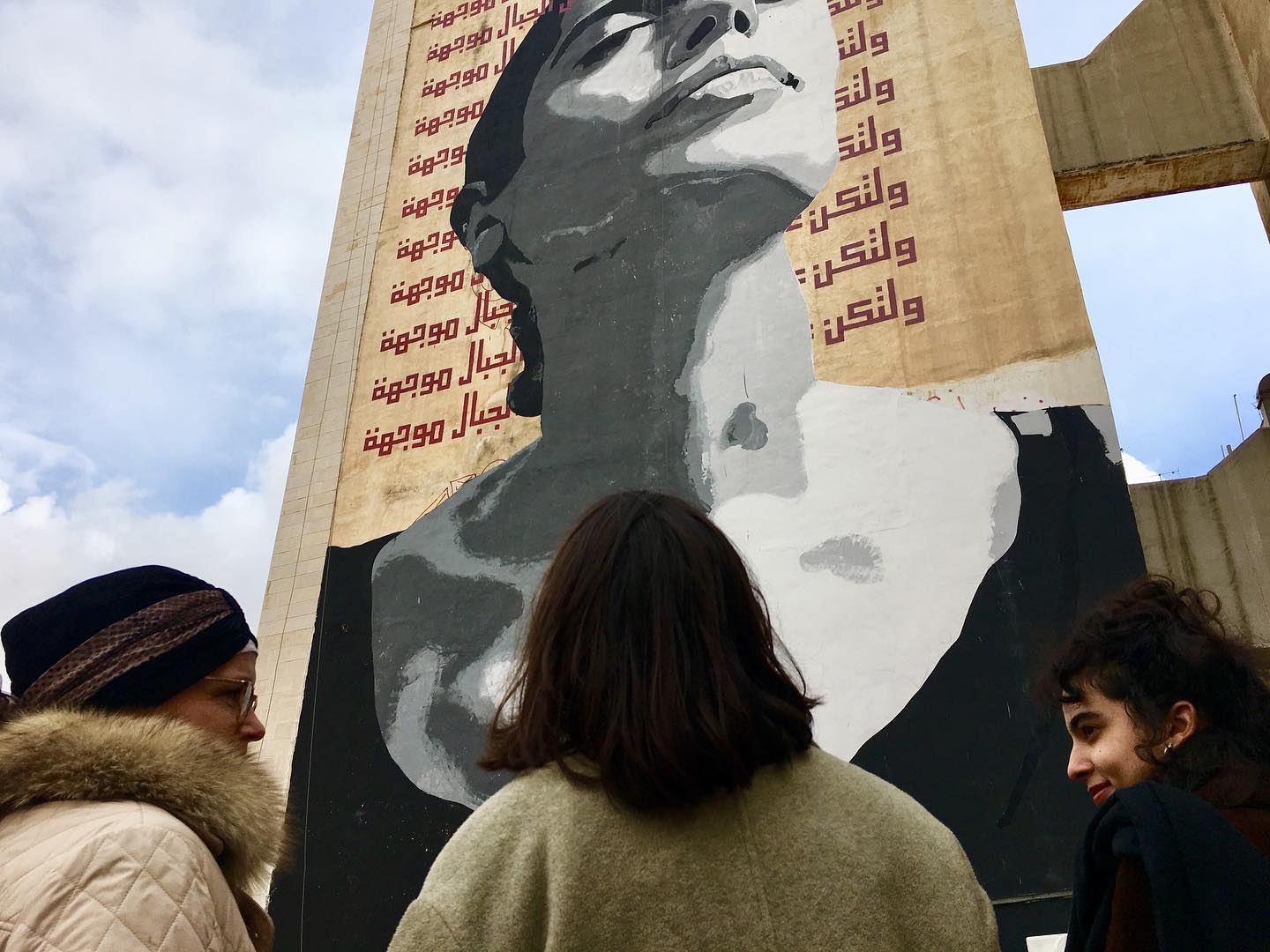 Ainsi, au cœur d’Amman, un portrait recouvre toute la façade d’un immeuble de huit étages. On y voit une jeune femme, en noir et blanc, les yeux clos, les cheveux ramassés dans un chignon bas, la nuque tendue vers le ciel. Derrière elle, en rouge, cette phrase calligraphiée en arabe, répétée plusieurs fois : « Que tes yeux soient accrochés au sommet des montagnes ».