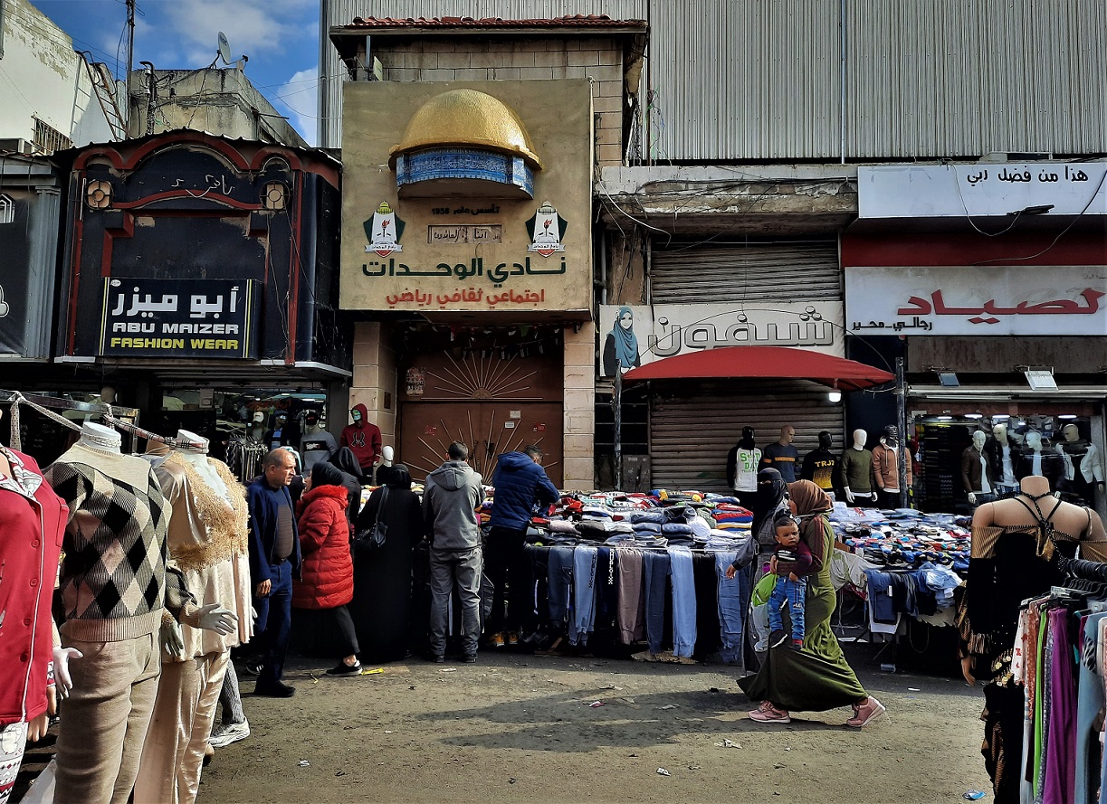 Au cœur du souk animé, la façade du « nadi » du camp de réfugiés palestinien d’al-Wehdat, dans le sud d’Amman, est surmontée d’une reproduction de la coupole dorée du dôme du Rocher de Jérusalem. À la porte, des portraits de martyrs palestiniens accueillent les visiteurs ; à l’intérieur, une carte de la Palestine d’avant 1948 côtoie un portrait du roi de Jordanie, Abdallah II, à la lueur des néons blafards.