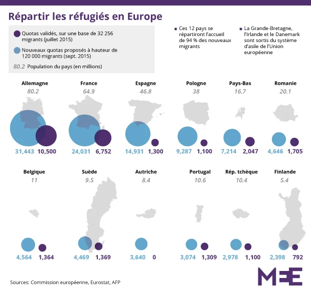 La Commission européenne a proposé que les États de l’UE se répartissent collégialement 160 000 réfugiés sur la base d’un système de quotas qui prendrait en compte la population et la capacité économique de chaque pays.