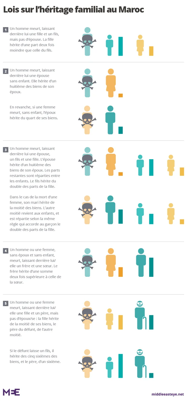 « Selon le droit successoral marocain, les hommes sont des héritiers universels pouvant disposer de tout l’héritage de leurs parents, tandis que les femmes héritent de parts fixes et ne peuvent pas recueillir la totalité de cet héritage lorsqu’elles sont les seules héritières », rappelle la pétition, qui se questionne sur l'utilité de « maintenir une règle qui non seulement n’a plus de justificatif social mais qui, de plus, n’a aucun fondement coranique » et qui « va à l’encontre des principes de justice du Coran et non dans le sens de ses finalités ».