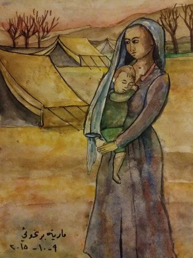 Cela ne l’empêche pas d’explorer les recoins de sa propre imagination et de puiser l’inspiration dans les sujets inéluctables de sa vie en Syrie. Son visage rayonnant d’innocence, elle montre l’une de ses dernières œuvres à la webcam sur Skype. « C’est une femme avec son enfant dans un camp de réfugiés. Elle est triste parce qu’elle a dû quitter sa maison. »