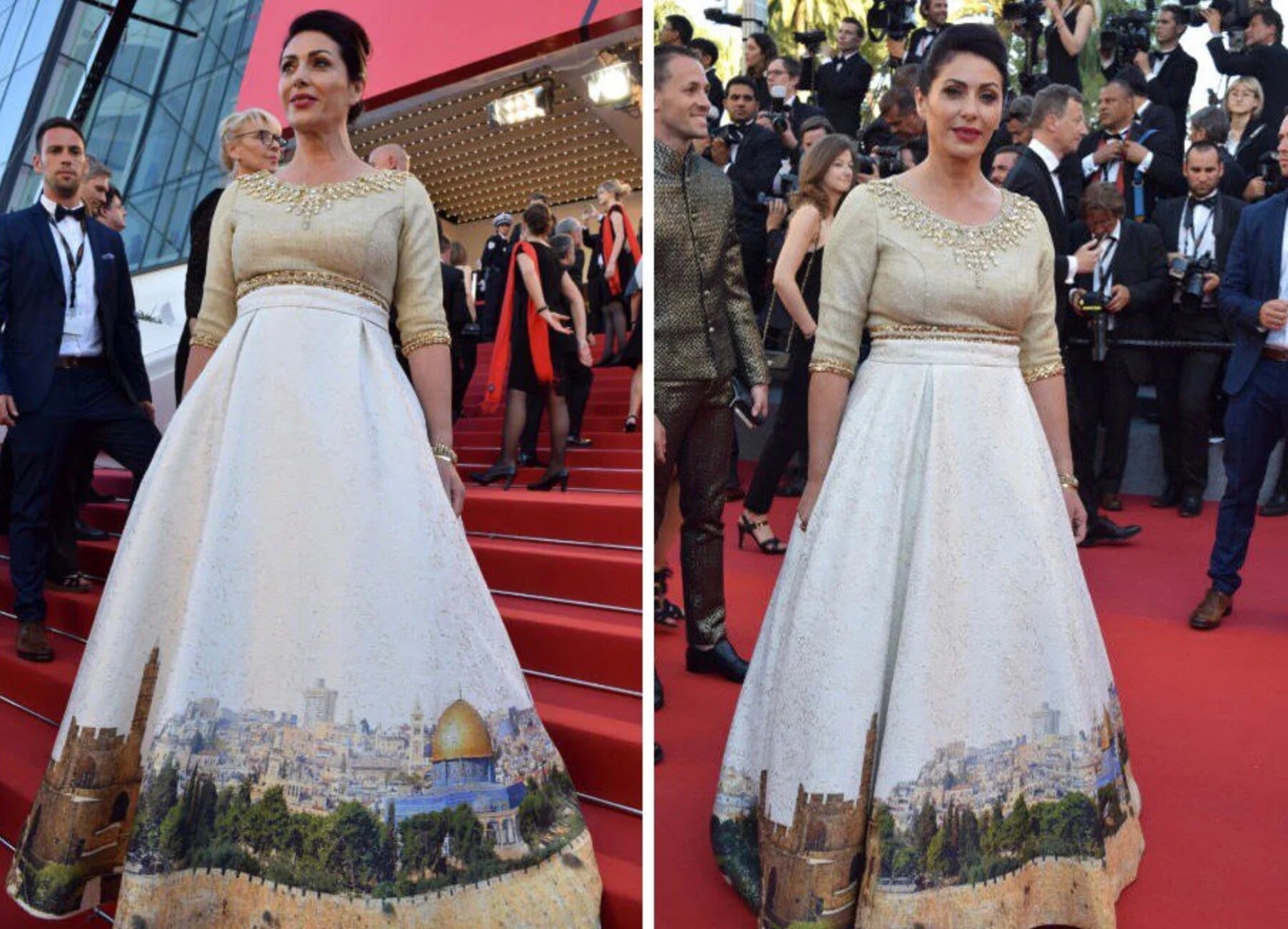 Traduction : « La ministre israélienne Miri Regev porte cette robe au festival de Cannes pour célébrer les 50 ans d’occupation d’Al Qods #Palestine avant/après montage »