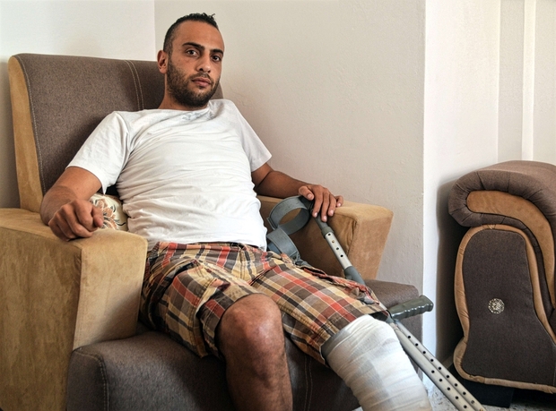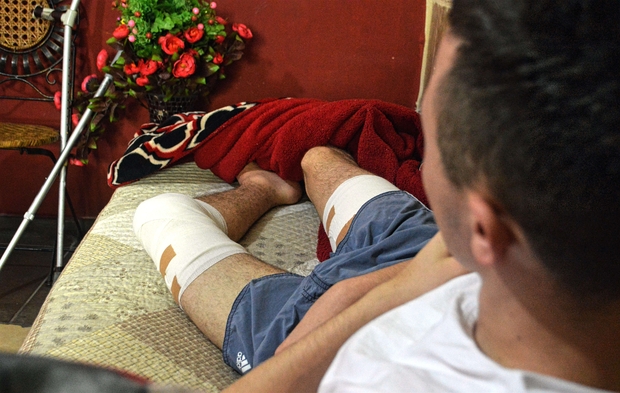 En dépit des neuf opérations qu’il a subies, Nidal ne s’est pas encore complètement rétabli de la balle qu’il s’est pris. Il marche encore avec des béquilles.
