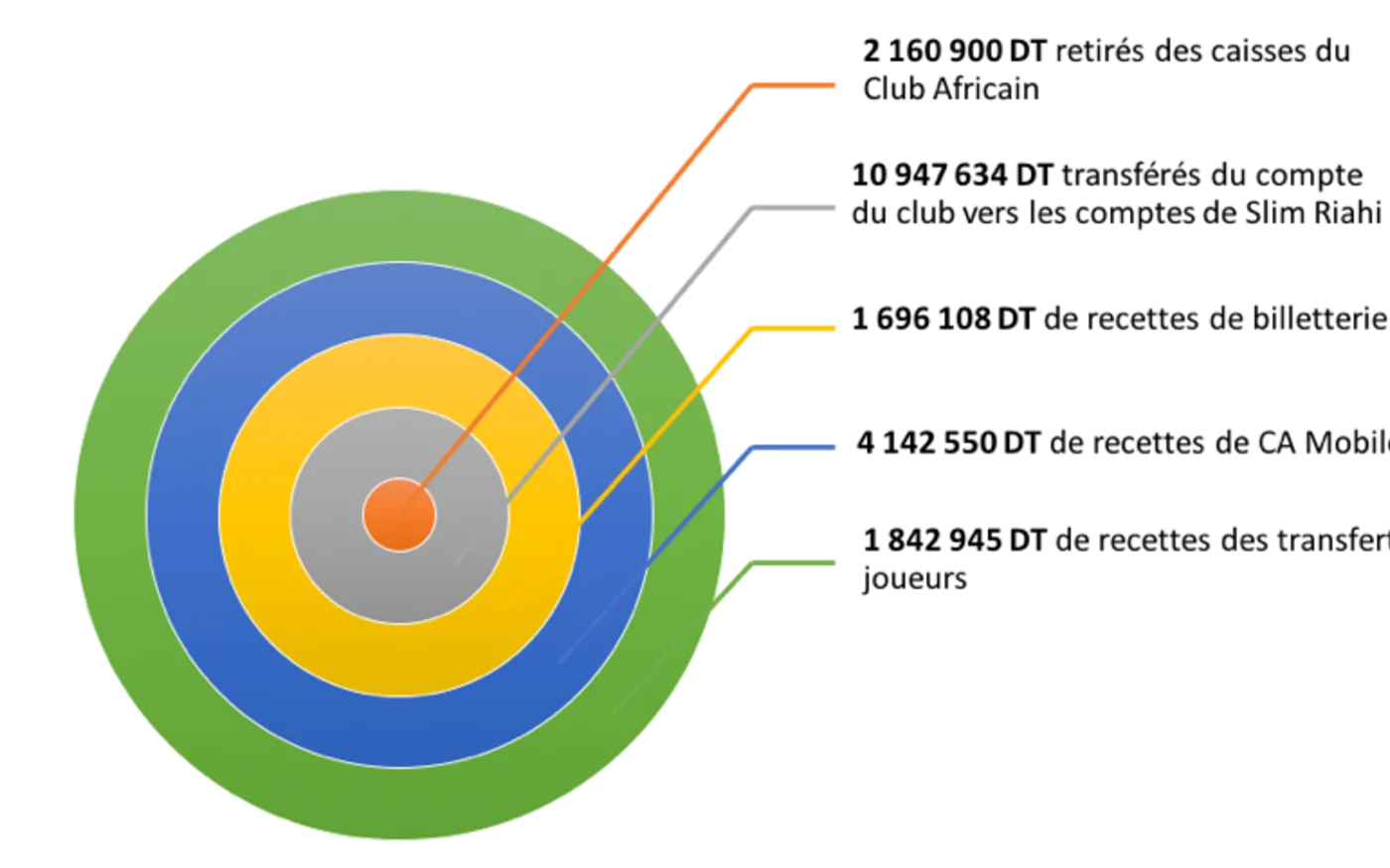 Plusieurs recettes provenant de la billetterie du stade, des transferts de joueurs ou autre, auraient été détournées des caisses du club par retrait ou virement bancaire, pour un montant total de 21 066 343 dinars (6,1 millions d’euros).