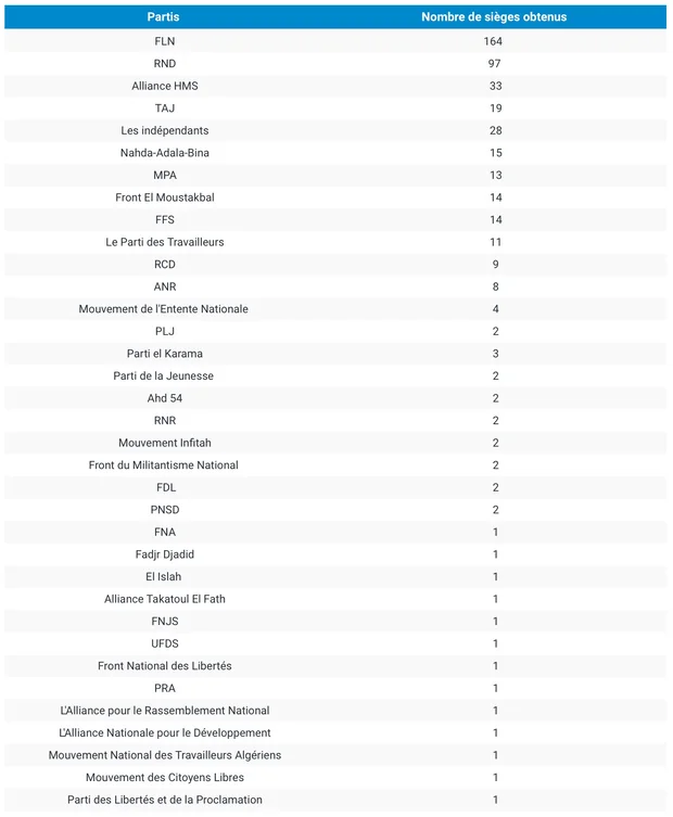 Sans surprise, les partis au pouvoir – Front national de libération (FLN) et le Rassemblement national démocratique (RND) – remportent les élections législatives, avec respectivement 164 et 97 sièges sur les 462, suivis par les partis islamistes (MSP, Adala, El Islah) cumulant 49 sièges.