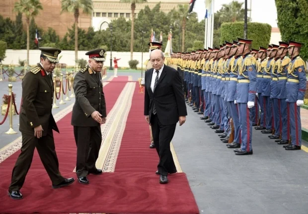 Le ministre français de la Défense, Jean-Yves le Drian, accueilli au Caire en février (AFP)
