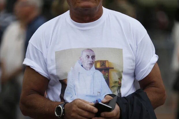 Un homme porte un T-shirt illustré avec le portrait du prêtre français Jacques Hamel, assassiné mardi dernier dans son église lors d’une prise d’otage revendiquée par le groupe État islamique (AFP)