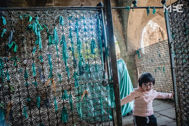 Accompagné de ses deux enfants, l’un calé sur sa hanche, l’autre enroulé autour de sa jambe, Nasir allume une bougie qu’il place dans une enclave ciselée dans le mur à l’intérieur de la synagogue. Quelques touristes chrétiens étrangers ont visité la synagogue aujourd’hui et des bougies se consument encore lentement. Des inscriptions en hébreu gravées dans le mur sont visibles près de Nasir.