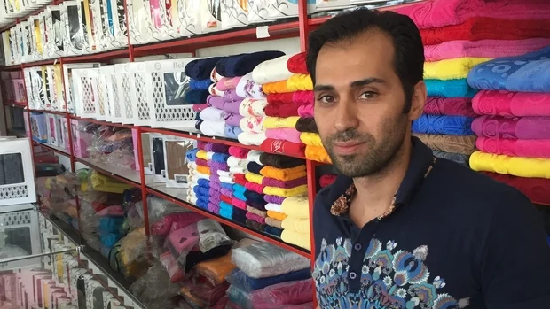 Le problème affecte les entreprises, tant les grandes que les petites, comme je l’ai découvert dans le district Saleh Abed au sud de Téhéran. Aidin Baravar y a un point de vente, dans le secteur du textile, qu’il dirige avec son père et d’autres membres de sa famille. Ils possèdent une usine à Tabriz dans le nord-ouest de l’Iran, laquelle emploie 80 ouvriers qui fabriquent des serviettes et des peignoirs.