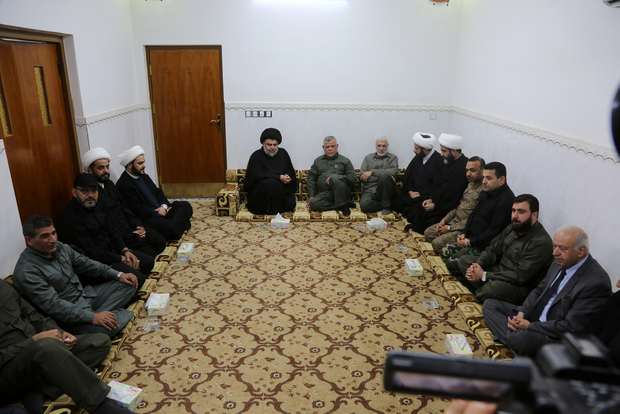 Des images télévisées diffusées par le bureau de Sadr ont montré l’ecclésiastique dans sa maison à Najaf lors d’une rencontre avec Abou Mahdi al-Mohandis, commandant supérieur des Unités de mobilisation populaire (UMP), et Hadi al-Ameri, chef de l’Organisation Badr, un groupe paramilitaire et parti politique puissant. Les deux hommes étaient en uniforme militaire et assis à côté de l’ecclésiastique.