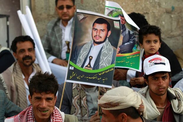 Un groupe de combattants houthis se tient à côté de la pierre ; l’un d’entre eux, debout sur celle-ci, tient un drapeau yéménite.