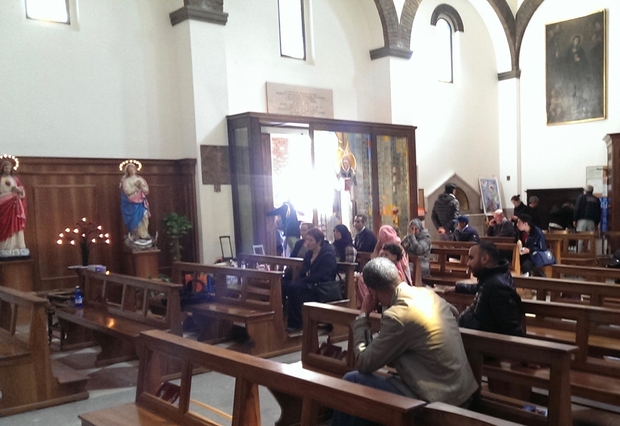 Les migrants cherchent de l’aide et un endroit pour dormir dans une église de Bologne, Italie (MEE/Farhad Mirza)