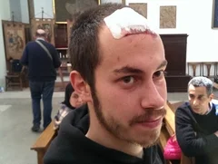 Federico Fornasari, un activiste du syndicat USB, menait les protestations dans la rue jusqu’à ce que la police ne charge les manifestants, l’obligeant à trouver refuge dans une église (MEE/Farhad Mirza)
