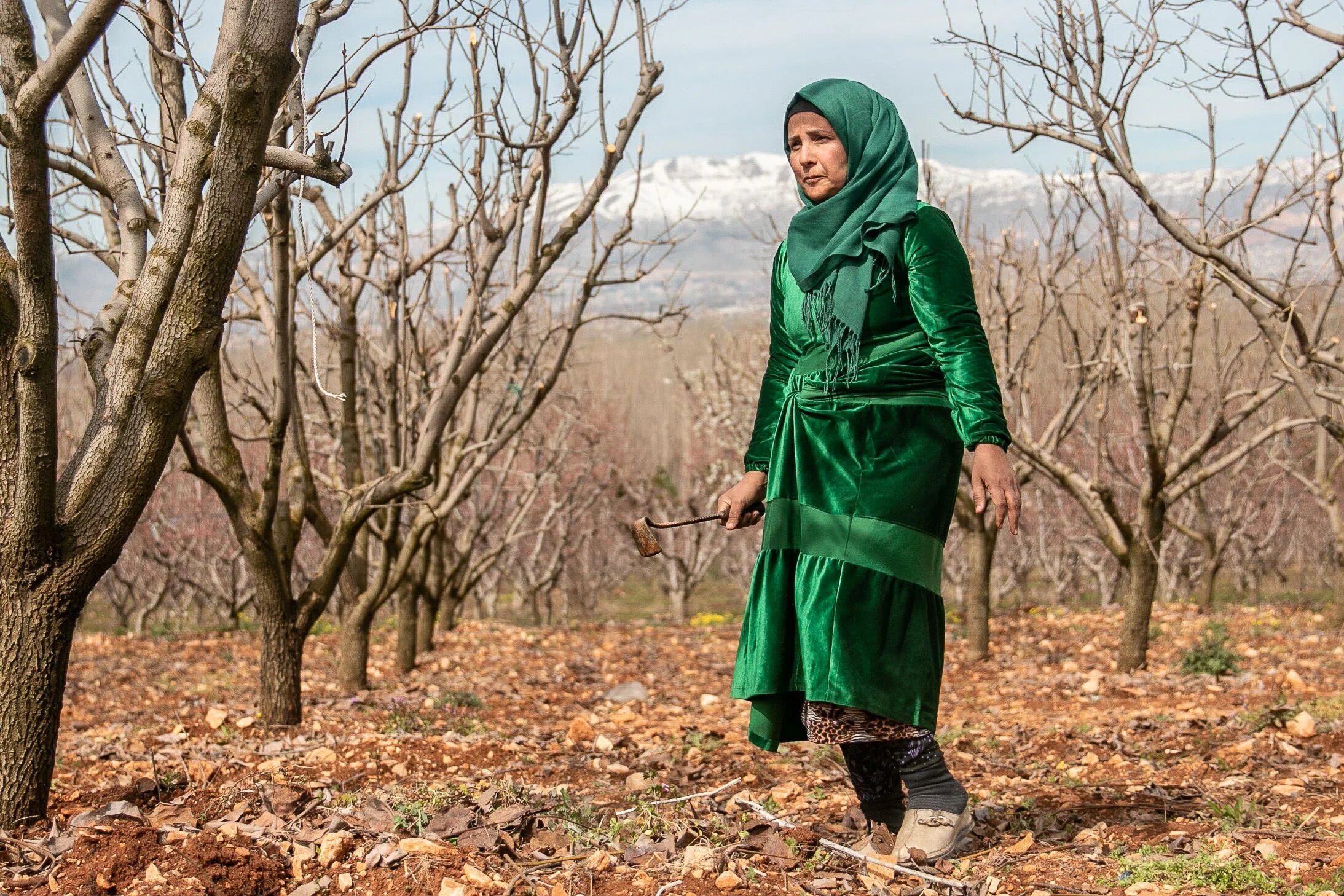 Dans ce verger situé près de la ville d’Anjar, dans la plaine de la Bekaa, les arbres encore en dormance dansent dans la brise légère et donnent sur les montagnes enneigées du mont Liban. Khawla travaille ici presque tous les jours pour subvenir aux besoins de sa famille.