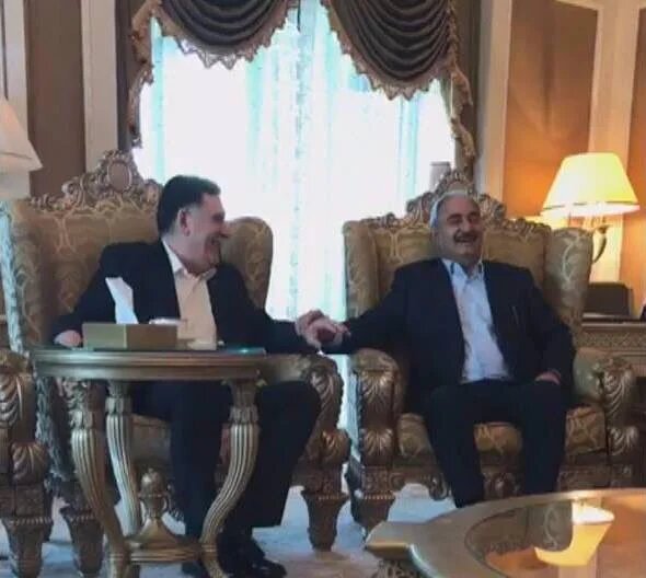 Traduction : « Vidéo du Premier ministre Fayez el-Sarraj et de Khalifa Haftar après leur première recontre à #AbouDabi hier. Détendus, en train de rire, sans cravate #Libye »