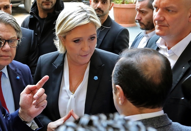 Marine Le Pen ( au centre) réagit après qu’un voile lui a été tendu avant sa rencontre avec le grand mufti cheikh Abdellatif Deriane à Beyrouth le 21 février (AFP)