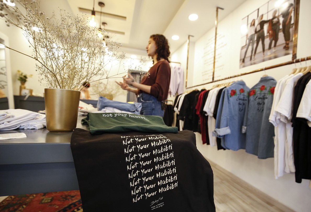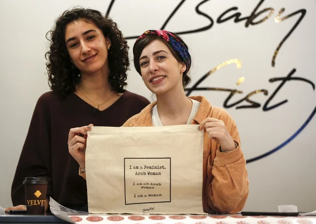 Les habits qu’elle dessine pour sa marque BabyFist veulent « redonner confiance aux femmes ». Sur des tissus plutôt sobres et des sacs en toile, des messages en arabe et en anglais sont inscrits au milieu de dessins de fleurs et de silhouettes : « Chaque rose a sa révolution », « La voix des femmes déplace la montagne »...