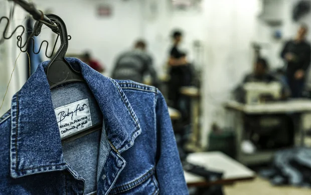 Au milieu des machines à coudre, sous la lueur blanche des néons, le patron présente avec un large sourire la veste en jean avec l’inscription « Not your habibti ».