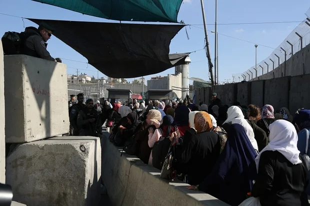 Par conséquent, le check-point de Qalandia, sur la route entre Ramallah et Jérusalem, était plus animé que d’ordinaire. Les embouteillages commençaient un kilomètre en amont, tandis qu’une foule de personnes descendait de taxis et d’autobus. Ce qui était habituellement la voie réservée aux véhicules au check-point était devenu l’entrée des femmes, où des groupes vêtus de longs manteaux et de hijabs défilaient. La police des frontières israélienne surplombait l’ensemble, perchée sur des blocs de béton, vigilante, fusils au poing.