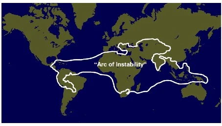 Bien que chacun utilise ce concept à son gré, cette carte illustre les frontières géographiques de cet « arc d’instabilité » d’un point de vue officiel américain. Cette extension englobant la majorité des pays du « Sud » (où ce qui est autrefois vaguement appelé le Tiers-monde) remonte à la stratégie militaire nationale des États-Unis de 2004. L’examen quadriennal de la défense de 2001 et le rapport annuel du Département de la Défense au président et au Congrès de 2002 utilisaient le concept mais dans un sens plus restreint en évoquant un grand « arc d’instabilité qui s’étend du Moyen-Orient à l’Asie Nord-Est ». Source : « Marine Corps Operating Concepts for a Changing Security Environment »,  2e éd., Departement of Navy, juin 2007.