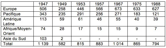 Nombre de bases américaines à l’étranger par région (1947-1988)