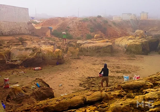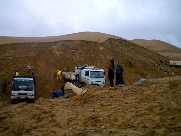 Kamal Arrifi pense que la plupart de ceux occupés à creuser le sable sont de jeunes Marocains des environs de la ville ayant désespérément besoin de travail et d’argent. « C’était une source fiable de travail et de revenu », ajoute-t-il. Des groupes de jeunes hommes et de garçons parfois âgés de pas plus de 12 ans se rendaient sur la plage armés de pelles pour remplir de sable des sacs de farine usagés, avant de les hisser sur des chariots transportés ensuite sur des sites de constructions à proximité. Dans les zones où le prélèvement était le plus extrême, la plage a fini par ressembler à la surface de la lune.